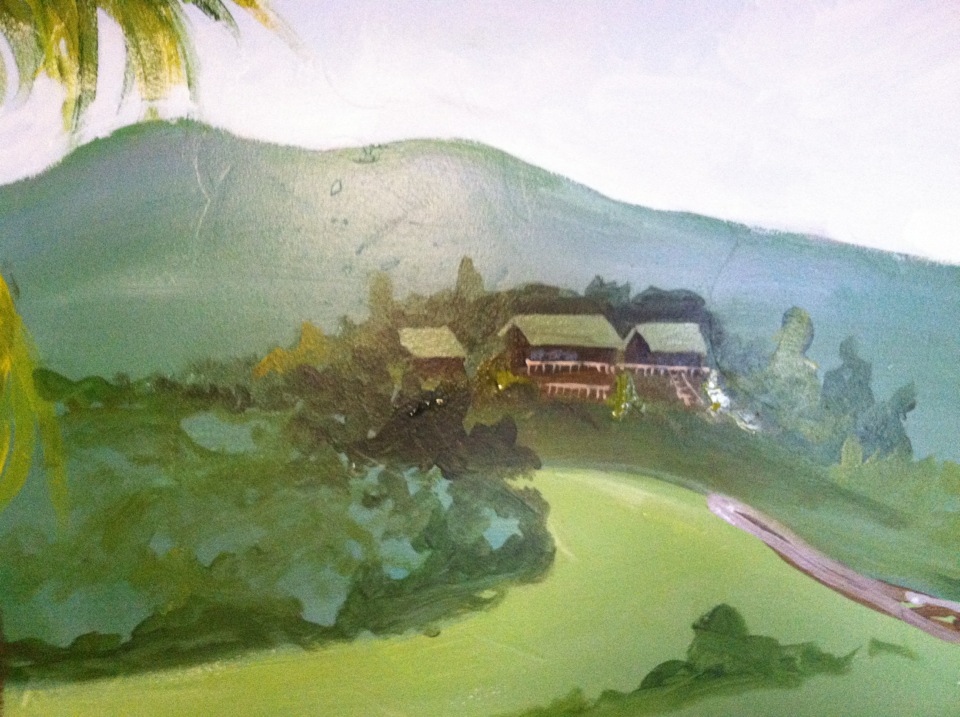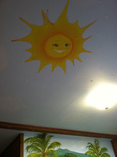 It was important to me to get the detail of Thomas the Train just right. I wanted my nephew to feel like Thomas was looking down at him while he lay in bed. Other details included rendering their house correctly; nestled into the side of Hualalai mountain. Clouds reached up and thru the ceiling with a warm smiling sun face shinning down over where my littelest nephew's bed sits. At night, glow in the dark stars glitter in the sky.