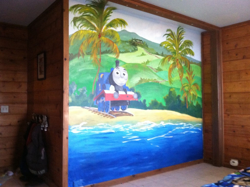 Artist's Comments: After the successful completion of the receiling mural I completed of the Kona Village resort, I was in for a treat when my little nephew asked me to paint his wall with Thomas the Train - his utmost favorite thing in the world! When I asked what else he wanted me to paint his imagination went wild! He wanted train tracks leading from his bedroom down to the ocean so Thomas the Train could live at his house; he wanted palm trees and waves and sand down by the shoreline. For a little extravagance, he wanted the volcano errupting with lava flowing past the house downdown the mountain and he wanted to be painted surfing down the hot lava on his surfboard! Well I liked everything up until the hot lava so, just in case my nephew has premenitions, I decided against painting an erupting Hualalai Mountain. On this project, I had two of the best personal assistants ~ they were so helpful in mixing all the colors together and marking the wall with large splashes of color. Good thing I let them go at it right away until they tired of the project and went to play outside. Whew! Now I just needed to cover those marks and I was ready to get moving on finishing the mural until they go reinterested in painting!